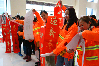 “春滿人間百花吐艷 福臨小院四季常安” “一帆風(fēng)順年年好 萬事如意步步高” ……1月26日至28日,麗匯大廈一樓熱鬧非凡,為了感激社會(huì)各界對(duì)綠港集團(tuán)的關(guān)心與支持,由綠港集團(tuán)工會(huì)組織的書法家“迎新春 送祝?!绷x務(wù)送春聯(lián)活動(dòng)吸引了大量前來求墨寶的社會(huì)各界人士。三位南寧市書法協(xié)會(huì)的書法家以及南寧科巨公司副總經(jīng)理陸章發(fā)為觀眾們現(xiàn)場(chǎng)揮毫,一幅幅金燙燙、散發(fā)著墨香的春聯(lián)映襯著人們的笑臉,整個(gè)現(xiàn)場(chǎng)彌漫著濃濃的年味,短短三天時(shí)間便送出了2000多副春聯(lián)。1月26日上午,綠港集團(tuán)工會(huì)還啟動(dòng)了派送春聯(lián)儀式,綠港集團(tuán)工會(huì)主席黃麗琴帶領(lǐng)工會(huì)人員將春聯(lián)送到經(jīng)開區(qū)40余位保潔人員、園林綠化工人、公司職工的手上。(張彩秀/文、圖)