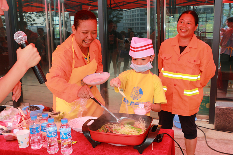 搶答活動結束之后,進入“小廚神”廚藝大比拼環(huán)節(jié)。由園林綠化工人、水電維修物業(yè)工人、保潔人員等進城務工人員組成的5組家庭展開了激烈的廚藝大比拼競賽??矗N神們在父母的指導下井井有條地備菜、炒菜、起鍋,忙得不亦樂乎。各色菜式色香味俱全,充分展現了孩子們“小當家”的本領。半小時后,小廚神們在大家的熱烈掌聲中完成了比賽菜品,廚藝大師及現場觀眾根據完成的速度、菜品、味道等評出廚藝大賽一等獎1名,二等獎2名,三等獎3名,優(yōu)秀獎10名。