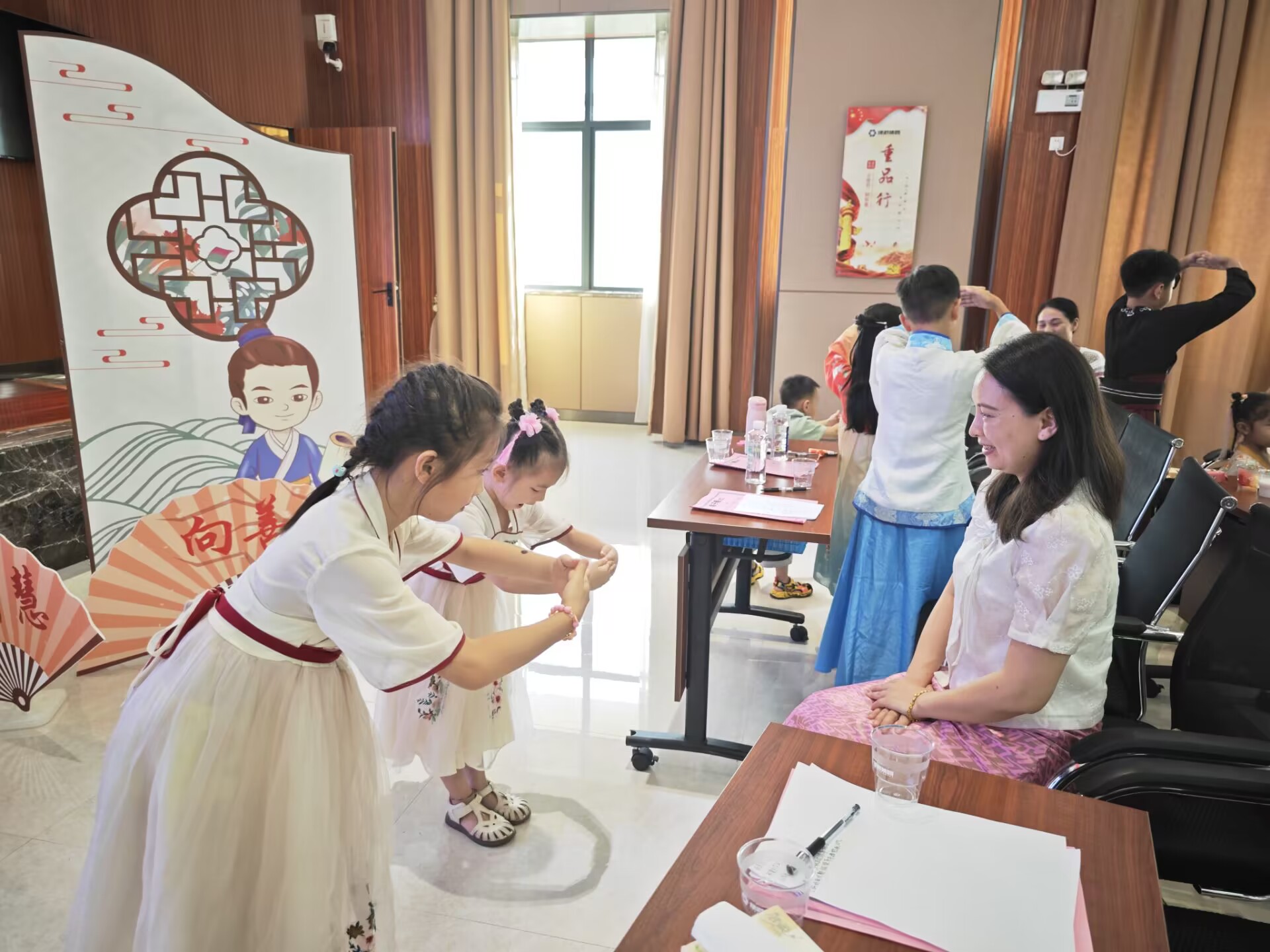 活動(dòng)以傳統(tǒng)禮儀的學(xué)習(xí)和體驗(yàn)為主題,此次培訓(xùn)邀請(qǐng)了廣西經(jīng)貿(mào)職業(yè)技術(shù)學(xué)院智慧商務(wù)產(chǎn)業(yè)學(xué)院的老師韋斯斯講授少兒禮儀知識(shí)。活動(dòng)中,韋老師向孩子們講解了《弟子規(guī)》中學(xué)習(xí)的重要、做人的道理以及待人接物的禮貌常識(shí),讓大家更好地理解傳統(tǒng)的禮儀。韋老師親身示范,教授大家如何正確行認(rèn)知禮儀、家庭禮儀、餐桌禮儀、待客禮儀、交往禮儀、入泮禮、作揖禮、孝道禮儀等,在抬手躬身中感受禮儀之邦的古韻,學(xué)習(xí)尊師重教的品德。韋老師結(jié)合理論知識(shí)學(xué)習(xí),邀請(qǐng)孩子們上臺(tái)實(shí)操演練,模擬情景表演、開(kāi)展親子互動(dòng)小游戲等,孩子們紛紛上臺(tái),為大家展示,將學(xué)到的文明禮儀知識(shí)落實(shí)到行動(dòng)中,培訓(xùn)現(xiàn)場(chǎng)生動(dòng)形象、氣氛熱烈,孩子們?nèi)褙炞⒙?tīng)取老師的講解,依照老師的示范,認(rèn)真的學(xué)習(xí)禮儀,體驗(yàn)傳統(tǒng)禮儀。